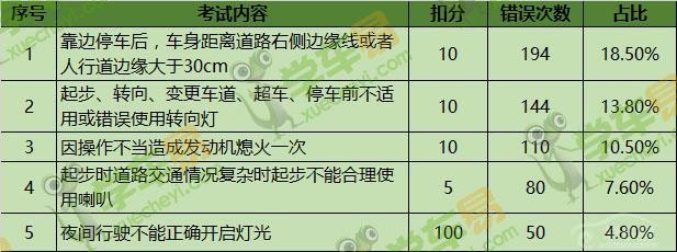 “靠邊停車后,車身距離道路右側(cè)邊緣線或者人行道邊緣大于30cm”中招的人最多,占比高達18.5%。其次是“起步……不適用或錯誤使用轉(zhuǎn)向燈”,占比也達13.8%。下表為錯誤占比最高的五項考試內(nèi)容。