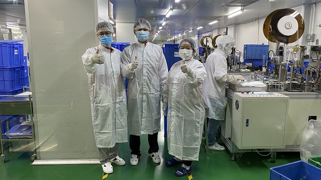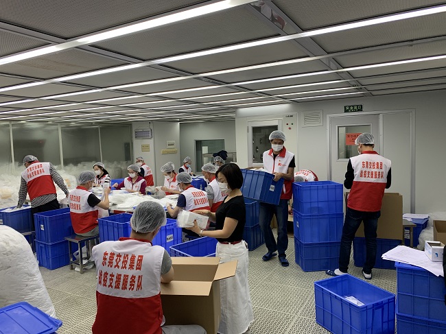 3月1日,交通實業(yè)公司第三批戰(zhàn)役支援服務隊員接替第二批隊員上崗,繼續(xù)助力東莞久林吉良凈化用品有限公司口罩生產(chǎn)。