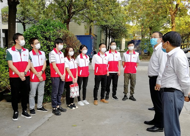 2月26日下午,交通實業(yè)公司黨總支部副書記、總經(jīng)理莫松堅,黨總支部副書記、監(jiān)事劉拓瑜,黨總支部委員、副總經(jīng)理李敬超等慰問組一行,到東莞久林吉良凈化用品有限公司看望慰問第二批戰(zhàn)疫支援服務(wù)隊員,了解近期的工作情況和身體狀況,傾聽隊員們志愿服務(wù)過程中的心得體會。