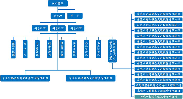 目前,交通實業(yè)公司管理層設執(zhí)行董事、總經(jīng)理、監(jiān)事和副總經(jīng)理。公司內(nèi)設“7部1室1事業(yè)部”,分別為黨群監(jiān)察部、辦公室、人力資源部、財務管理部、投資經(jīng)營部、物業(yè)開發(fā)部、合約管理部、安全監(jiān)管部及靜態(tài)交通事業(yè)部,下設東莞市機動車駕考服務中心有限公司、東莞靜態(tài)交通投資有限公司。公司員工約450人,隊伍結(jié)構(gòu)較為年輕,管理人員平均年齡為31歲。