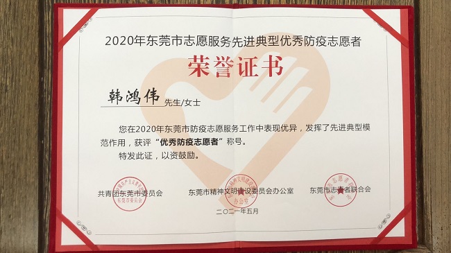 根據(jù)團市委、市文明辦、市志愿者聯(lián)合會近日發(fā)布的《關(guān)于命名2020年度東莞市志愿服務先進典型的決定》,交通實業(yè)公司獲評2020年度東莞市志愿服務先進典型愛心企業(yè),下屬黃江靜態(tài)交通公司韓鴻偉同志獲評2020年度東莞市志愿服務先進典型優(yōu)秀防疫志愿者。