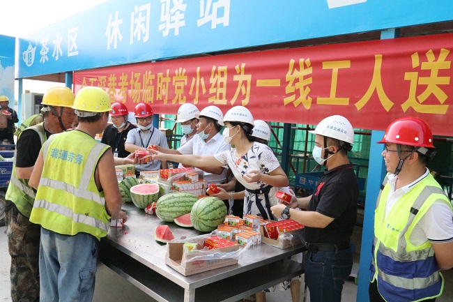 為切實(shí)做好一線人員的防暑降溫工作,8月24日下午,交通實(shí)業(yè)公司黨總支部副書記、監(jiān)事劉拓瑜,黨總支部委員、副總經(jīng)理琚明杰帶領(lǐng)黨群監(jiān)察部、工程管理部及企石深巷考場(chǎng)臨時(shí)黨小組成員,與企石深巷村一起到企石深巷考場(chǎng)施工現(xiàn)場(chǎng),為高溫下堅(jiān)守在一線的工人們送上藿香正氣水、涼茶飲品、西瓜等防暑用品,并一一發(fā)放到工人手中,對(duì)他們不懼炎熱、堅(jiān)持作業(yè)的精神表示贊揚(yáng)和感謝,同時(shí)叮囑大家在快馬加鞭大干期間,要根據(jù)露天施工作業(yè)體能消耗大的實(shí)際情況,合理調(diào)配作業(yè)時(shí)間,注意防暑降溫、勞逸結(jié)合,保證身體健康,確保各項(xiàng)工作有條不紊地進(jìn)行。施工現(xiàn)場(chǎng)負(fù)責(zé)人表示,將繼續(xù)加大防暑降溫投入,合理安排工人作業(yè)時(shí)間和勞動(dòng)強(qiáng)度,確保大家平穩(wěn)度過(guò)高溫施工階段。